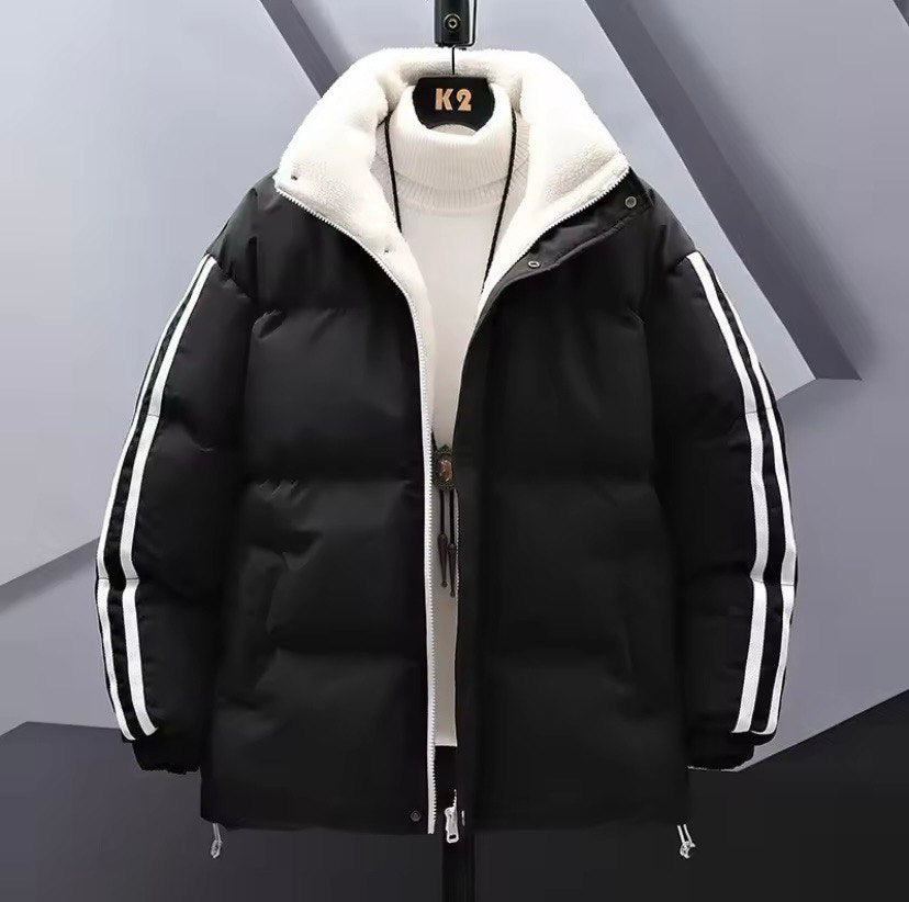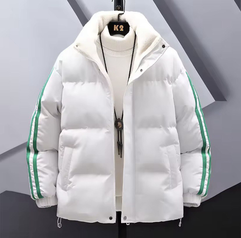 Le bande verdi lungo le maniche aggiungono un tocco sportivo e fresco, dando movimento e personalità al capo. La combinazione di questi dettagli con il bianco dominante crea un look moderno e giovanile, perfetto per chi cerca un equilibrio tra praticità e stile.